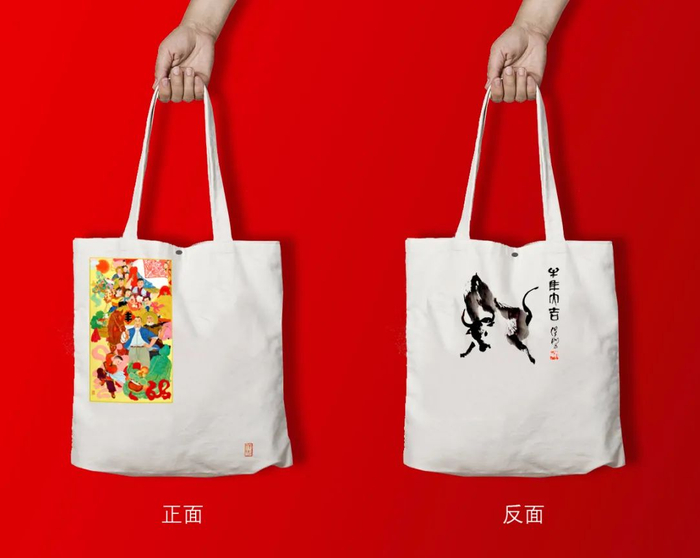 帆布包正面印有《丰收图》,反面为保彬所绘奔牛图,整个帆布包为米色,尺寸35*40CM,开口磁吸扣设计。