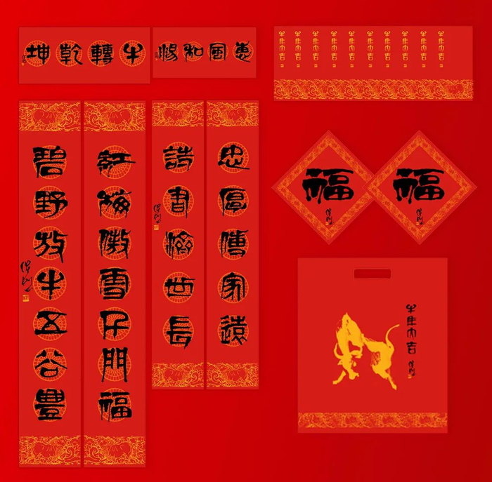 春联套装含春联2幅、福字2张,红包袋10只、牛年福袋1只。春联设计独出心裁,将艺术与设计融合到极致。