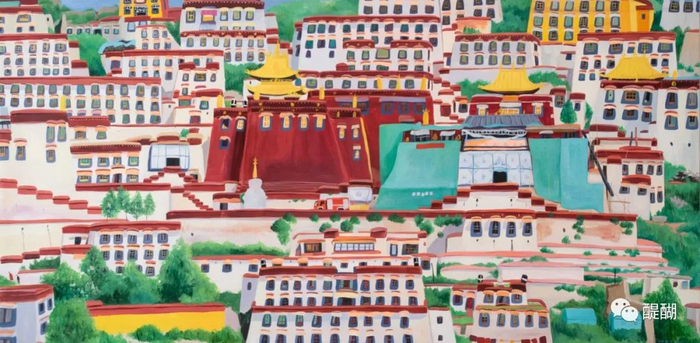 展览“日光城”以一小幅怀旧的街道开始,逐渐呈现出作为旁观者的她眼中的拉萨人文风貌与光影。作品《日光下的甘丹寺》则是以霍克尼式的视觉试验,从多角度描绘雄伟的寺院,同时也加入了艺术家看到的现代元素,如正在修复的建筑所特有的大吊车、绿网等。