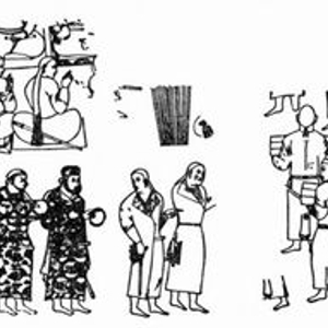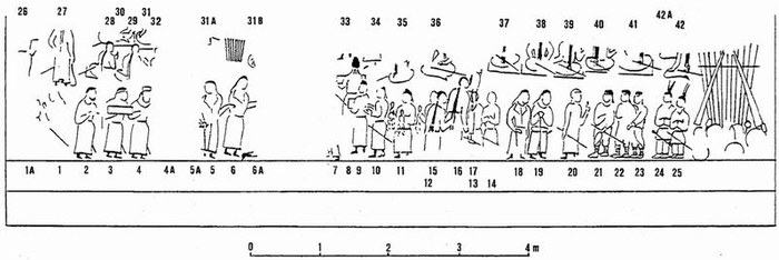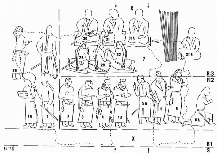 在聚集于右侧中心人物周围的整个随从人员中,有一组官员持有相同的手杖(M42以及一个保存较差的位于其上)礼貌地坐着,但是他们不是坐在地摊上,而是蹲在地上。他们(像M18一样持有相似的手杖)小拇指上戴着指环(可能两只手上都戴着)。……
