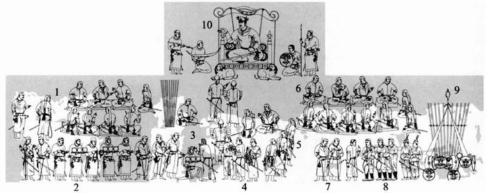 通过对组合位置、属性以及服饰细节的分析,我们可以更清晰地勾勒出阿弗拉西阿卜壁画中以下的突厥社会群组。