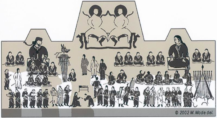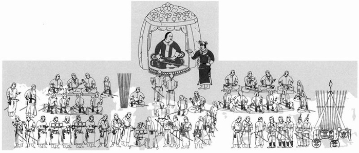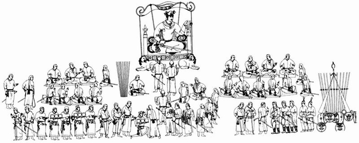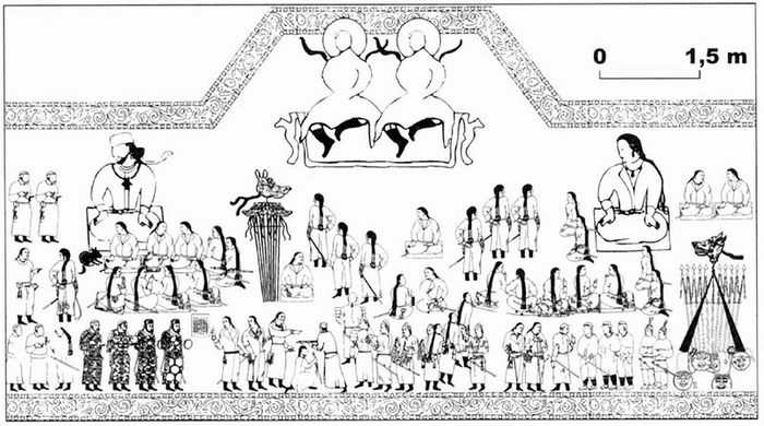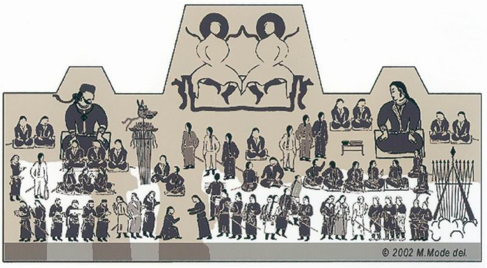 在左边的坐着的官员中,“旗和鼓”的组合占据了一个特殊的位置(中古时期游牧民族的相似例子可参见M.Mode 1993, 28-29, abb.8-9)。在左边和右边坐着两个穿着黄色长袖大衣和红色头巾的人(M32以及其右侧的)。穿着黄色长袖大衣和红色头巾的M41在右侧人群的中心位置。(除了主要人物之外)还有四位官员坐在地毯上,分别位于左右两边;此外还有两组低等级司仪(一组是M33、34,朝向左侧唐朝大使的方向行进;一组是持有红色手杖的M42及其上部的人物,他们跽坐在右侧没有地毯的主要人物身后)。