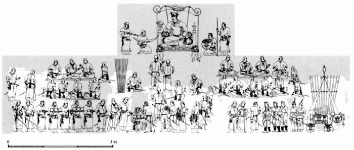 第1组:由主要人物与一组立于右侧的官员组成。M6、9、27正通过翻译人员的帮助与大使成员交谈(M27:赤鄂衍那大使的讲话内容写在衣服上)。M19手持一只长手杖,其上端后部呈“Г”形。M27手持一根宫廷打马球所用的球杆。