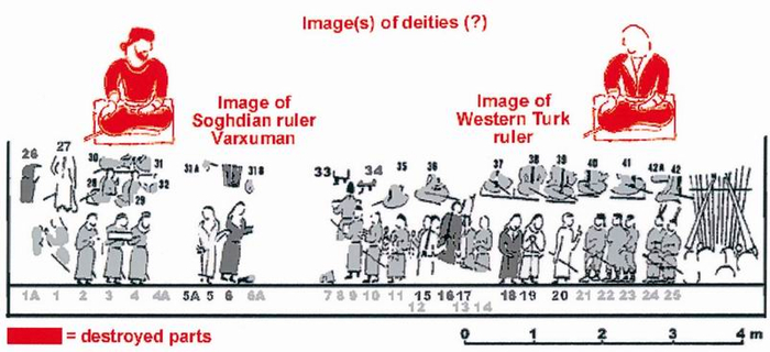 画面中央是统治者的绘像,是画中最大者,占了整个大厅5-6米的高度。从他的左右两方各国的使节手捧贡礼向他走来。左边一组领首的是一名书记官,而后是由七人组成的“进谒撒马尔罕的赤鄂衍那使节团”。这一点可从其中一人衣服空白处写的粟特文题辞得到证明。他们身穿奇异图案的长衫,头系带子,作两列向粟特王的宝座走来。右边的画面可看出二次重画的痕迹,重新画了一组献礼者的行列从另一端向中央走来,好像也是七个人。画上也有说明这些人物的粟特文题辞。根据外表判断,是柘枝和费尔干纳的使者,也许是维吾尔人(突厥人)和新疆的居民。他们都抬起脚跟用脚尖走路。最靠近宝座的一人面向里北朝观众,脚踩无法看清的台阶向上趋身,手捧贡礼高举过头,向上坐的王献去。……但是,现在完全可以肯定,阿弗拉西阿卜宫殿的壁画是一个独立的艺术体系的完整而精美的展现。它的诸项原则独特别致,与众不同,运用得又圆熟自如,具有无可争辩的光彩,这只能出自大师们老练有素的手笔。