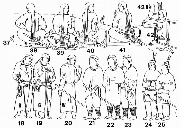 4)显然,朝向坐着的人物笔直站立的3位官员(M15-17),表现出官僚体系中等级最低的那些人。在所有其他突厥人中,他们没有持任何武器,很明显他们也不佩戴黄金带,而是佩戴银质(?)带(M15、17并未完成且没有完全着色,而M16则描绘得格外清晰)。他们没有戴金属项圈。这些官员有4条长辫。不过,此处所提这些人物所穿的长袖大衣,在剪裁和装饰方式上则与其他突厥人的服装没有区别。