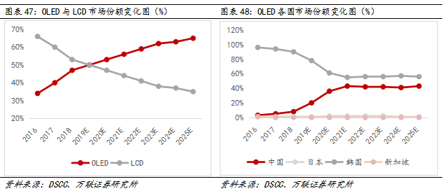 OLED市场渗透加速,国内市场份额不断增加。据DSCC数据显示,目前全球OLED对LCD的替代效应逐渐增强,OLED市场份额不断增加,预计2020年将超过LCD成为主流的面板显示材料。同时,随着OLED下游应用场景的不断增加,中国市场份额增长迅速,预计2021年达到41%,位居全球第二。