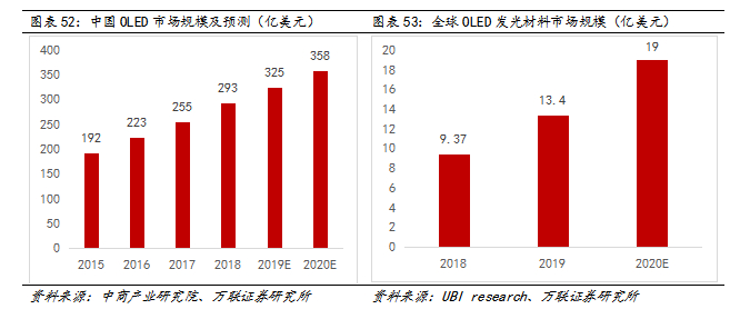 OLED市场规模稳步增长。据中商产业研究院数据显示,随着OLED市场应用的多元化和产业发展的集群化,2019年我国OLED市场规模将达325亿美元,并预计2020年将达到358亿美元。同时,随着OLED市场的大幅增长,OLED发光材料同步增长,预计2019年全球发光材料市场规模将达19亿美元。