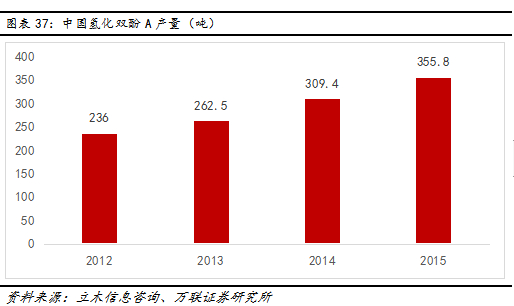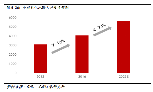 主要面对高端应用领域,市场需求较大。氢化双酚A和双酚A应用领域基本相同,但由于氢化双酚A无毒、化学稳定性等特点,更多的应用于LED封装、高价值电器绝缘材料、风机叶片涂层层、医疗器械部件、复合材料等高端制造应用领域。新材料领域的发展和树脂产业的不断升级,对高性能聚碳酸酯和环氧树脂的需求越来越大,氢化双酚A需求逐渐增加。据QYR统计,全球市场中,氢化双酚A产量从2012年的3077吨增加至2016年的4058吨,并预计2023年达到5612吨。