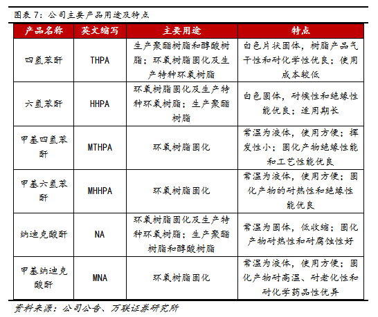 深耕顺酐酸酐衍生物类,产品技术国内领先。顺酐酸酐衍生物是公司重要的主营产品类别,包括四氢苯酐、六氢苯酐、甲基四氢苯酐、甲基六氢苯酐、纳迪克酸酐、甲基纳迪克酸酐等,凭借该领域丰富的经验,公司已成为国内规模最大、产品线最齐全的顺酐酸酐衍生物生产企业之一,主要产品技术指标行业领先,同时,六氢苯酐、纳迪克酸酐等产品质量达到进口替代水平,获得诸多化工巨头使用认证。