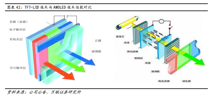 OLED特点明显,在小尺寸平板显示中应用较多。与液晶面板相比,OLED面板不需要背光源,厚度、能耗和亮度等指标更优,同时避免了显示延迟、水平/垂直视角失真、不可弯曲等问题,被行业认为将成为第三代主流显示技术。目前,AMOLED是OLED技术主流产品,终端应用包括智能手机、智能电视、智能手表等产品屏幕。相比与TFT-LCD显示技术,AMOLED采用自发光技术,对比度高、厚度薄、视角广、反应速度快、驱动电压较低、使用温度范围广等优点。同时,由于柔性AMOLED面板可弯折的特点,在当下曲面屏迅速发展的智能手机市场中应用逐渐增多,是当前主流显示技术市场中发展最快、应用前景最好的技术之一。