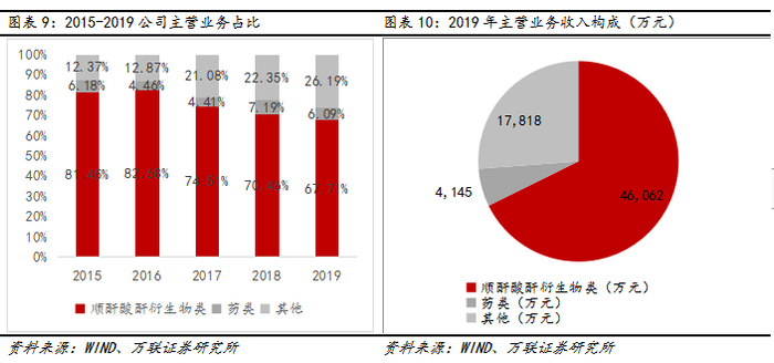 顺酐酸酐衍生物类产品份额最重,功能材料中间体及其他营收占比逐年扩大。从公司营业占比来看,目前公司营收的主要来源仍为顺酐酸酐衍生物,但占比逐年降低,公司不断布局功能材料中间体项目,开拓新的市场,营收占比不断提高。2019年顺酐酸酐衍生物类业务收入为4.6亿元,占营收总额比为67.71%,占比较2015年同期下降了13.29个百分点;相反,功能材料中间体及其他类业务发展迅速,2019年合计营收达2.2亿元,占总额比达到32.29%。