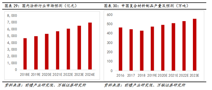 涂料、复合材料市场规模不断增加,顺酐酸酐衍生物市场前景较好。据前瞻产业研究院统计,预计国内涂料行业2024年市场规模达6973亿元,2023年复合材料制品产量将达556万吨,市场规模稳定增长。以顺酐酸酐衍生物为原料的聚酯树脂涂料具有优良的气干性、耐候性和耐热性,醇酸树脂涂料还具有较好的密着性、弹性、光泽度和耐水性,被广泛应用于于汽车、金属卷材、家具、电器制品、精密机械等领域中。由顺酐酸酐衍生物生产的不饱和聚酯树脂工艺好、成本低、易成型等特点使复合材料可以体现出轻质、高强和多功能等特性,被广泛应用于轨道交通、绿色建筑、风电开发、化工防腐、海洋工程、电力电气等领域中。随着涂料和复合材料的市场规模不断扩大,顺酐酸酐的下游需求逐步增加。