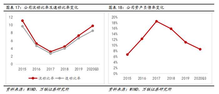 企业资金流动性不断改善,偿债能力持续优化。2017-2019年,公司的流动比率与速动比率逐年增加,2020年Q3分别达到9.8与8.5,企业资产的流动性较好,短期偿债能力较强;同时,公司的资产负债率自2017年开始逐年优化,负债所占资产比例逐年降低,财务风险较小,长期偿债能力较强。