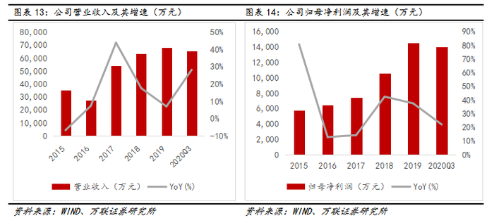 市场规模不断扩大,企业业绩持续向好。依托公司先进的研发技术和生产工艺,公司在顺酐酸酐衍生物和功能中间体等产品的质量、价格、客源及柔性化生产等方面形成较大的优势,市场规模不断增加,营业收入与归母净利润快速增长。在2019年报告期内,公司的营业收入达到6.8亿元,同比增加7.0%,2020年Q3更是达到了6.6亿元,三季度营业收入超过2018年全年营业收入,同比增长高达28.3%;同时,公司利润水平同步高速增长,2019和2020年Q3分别实现归母净利润1.5亿元和1.4亿元,同比增长分别为37.53%和22.10%。公司报告期内经营能力强劲,发展速度较快。