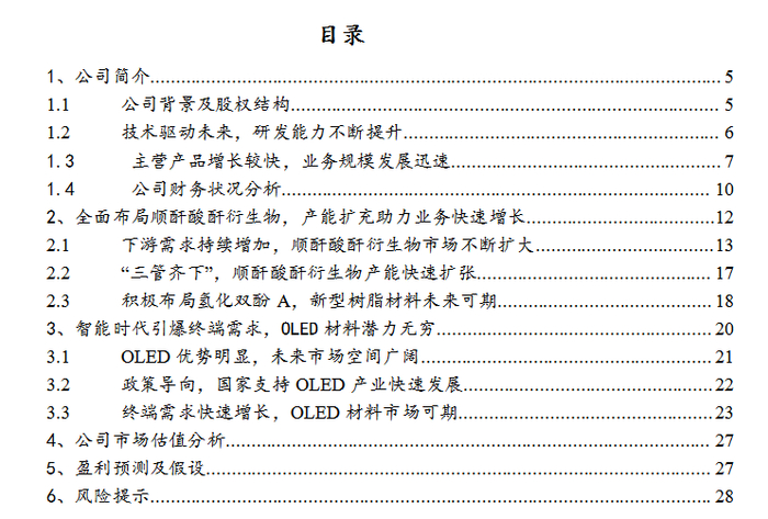 专注发展顺酐酸酐衍生物,OLED市场广阔,相关产业初具规模。目前,公司主要从事顺酐酸酐衍生物、功能材料中间体等精细化学品的研发、生产、销售,是目前国内产量最大,品种最全的顺酐酸酐衍生物生产企业之一。顺酐酸酐衍生物生产企业的龙头,获得了多个国际化工巨头认可,顺酐酸酐衍生物主要产品为四氢苯酐、六氢苯酐、甲基四氢苯酐、甲基六氢苯酐、纳迪克酸酐、甲基纳迪克酸酐等,主要用于环氧树脂固化、合成聚酯树脂和醇酸树脂等,广泛应用在电子元器件封装材料、电气设备绝缘材料、涂料、复合材料等诸多领域。公司在功能材料中间体主要产品包括芴类、咔唑类、有机膦类等化学品,主要用于OLED等有机光电材料及医药等领域。随着电子电气、涂料及复合材料等下游企业的需求的不断增加,公司功能材料中间体领域高速发展,成为国内少数能实现OLED材料中间体规模化生产的企业之一。