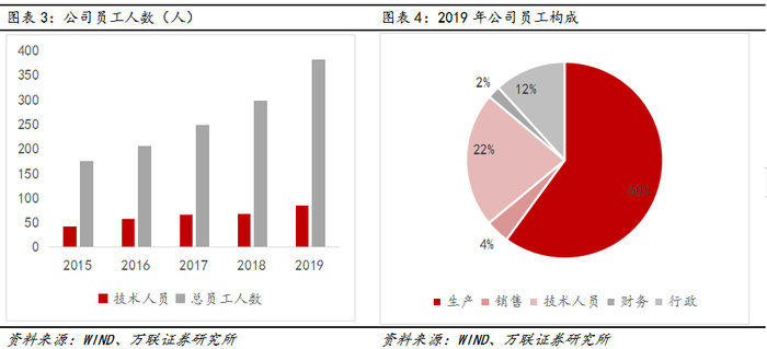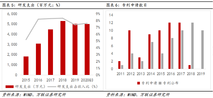 全力研发,重视人才,研发投入逐年增加。目前,公司已获得授权专利85项(56项发明专利,29项实用新型专利),2019年研究人员数量达到85人,较2018年同期增加25%,占公司员工总数的22.19%。研发投入与专利研发数量逐年增加,2018-2019连续两年研发投入金额超5,000万,2017-2019年度研发投入占营业收入比例的比例均为7.3%以上。