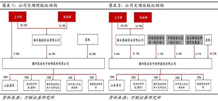 计划引入战略投资者,股权机构稳定。目前,实际控制人为王中锋和杨瑞娜,合计持有公司46.39%的股份。王中锋先生现任公司董事长兼总经理,濮阳市奥城实业有限公司执行董事,杨瑞娜女士现任河南省科学院化学研究所有限公司电子化学品研究室主任、公司董事。公司2020年7月发布公告称,拟引入深创投集团、深创投转型升级基金、中新睿银、融创岭岳基金和金石转型升级基金等战略投资者,定增后王中锋、杨瑞娜夫妇直接和间接持有公司股份占公司本次发行后总股本的38.25%,仍为公司的实际控制人,股权结构稳定。