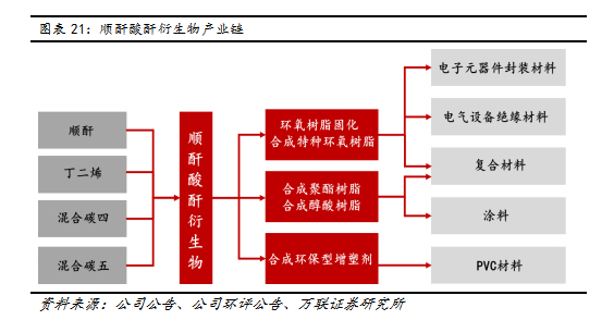 应用领域广阔,顺酐酸酐衍生物产业快速发展。顺酐酸酐衍生物主要用途为环氧树脂固化,合成特种环氧树脂、聚酯树脂、醇酸树脂和环保型增塑剂等,下游应用领域主要包括电子元器件封装材料、电气设备绝缘材料、复合材料、涂料和PVC材料等。目前下游应用最多的产品为四氢苯酐、六氢苯酐、甲基四氢苯酐和甲基六氢苯酐等,随着技术的不断发展和工艺的不断创新,纳迪克酸酐、甲基纳迪克酸酐等产品用量有望不断提升。