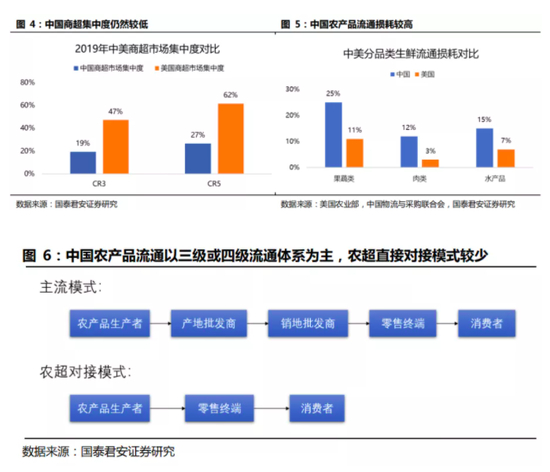 中国超市不仅未成为生鲜流通的主渠道,而且其内部市场集中度仍偏低,CR5仅27%。较为分散的竞争结构,阻碍了规模经济的实现,使得我国农产品的农超对接比例不足30%,约70%的农产品仍采用三级或四级流通体系。