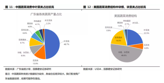 具体来看,美国的蔬菜消费,以土豆、西红柿、胡萝卜等容易运输、储存的块根、瓜果品类为主。而中国蔬菜的品类,以绿叶类蔬菜为主。