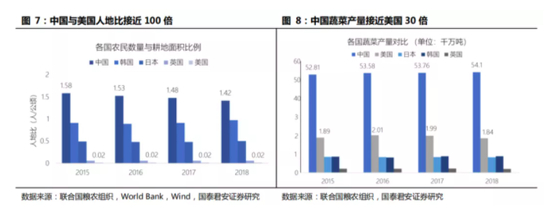 中国的农民数量与耕地面积比例接近美国的100倍,这种悬殊的差距不仅塑造了中国小农经济的地理基础,也使中国成为了蔬菜大国——种植蔬菜比种植粮食消耗更多的人力。