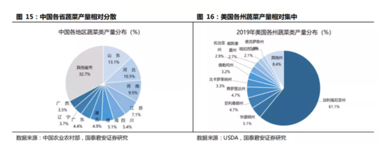 例如,从蔬菜产量分布来看,中国的蔬菜产区相对分散,本地供给更有成本优势。中国蔬菜产量最大的省份山东省产量仅占全国的13%,而美国仅加州一个州的蔬菜产量便占全国60%。