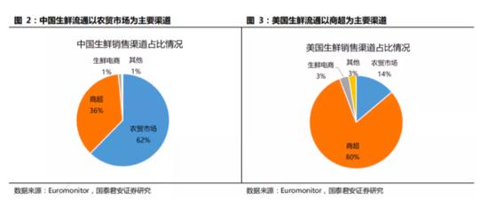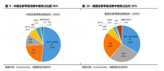 中国蔬菜产量接近美国30倍。在中国生鲜销售量中,蔬菜占据了52%,而在美国,蔬菜仅占34%。