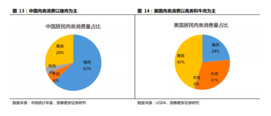 在肉类中,中国人以猪肉为主,而美国人以适合低温冷冻的禽类和牛肉为主。猪肉在冷冻过程中口感丧失较为严重,因此,中国人偏爱热鲜和冷鲜猪肉,而美国的牛肉和禽肉则以冷冻运输为主。