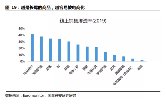 因此,越是长尾的商品,其线下零售合理售价中所含的库存成本占比越高,便越容易被电商化。我们在电商渗透率快速提升的过程中,也看到这种品类的分化。图书、服装、3C、美妆等长尾商品,成为电商与传统百货之争的核心阵地。
