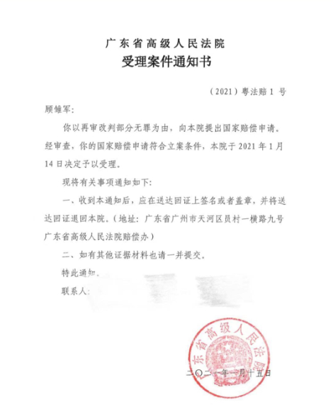 该通知书称:你以再审改判部分无罪为由,向本院提出国家赔偿申请,经审查,你的申请符合立案条件,本院于2021年1月14日决定予以受理。