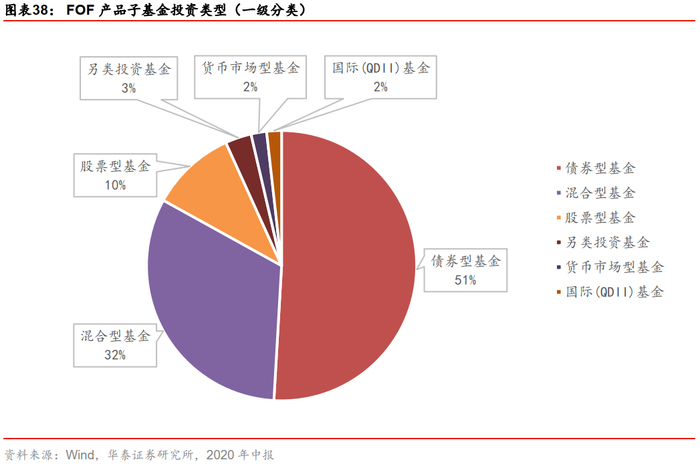我们采用2020年中报数据对FOF产品持仓基金类型进行了统计,并展示在了下方图表中。从一级投资分类来看,FOF产品配置债券型基金的比例最高,达51%,混合型基金配置比例次之,为32%,股票型基金配置比例第三,为10%。