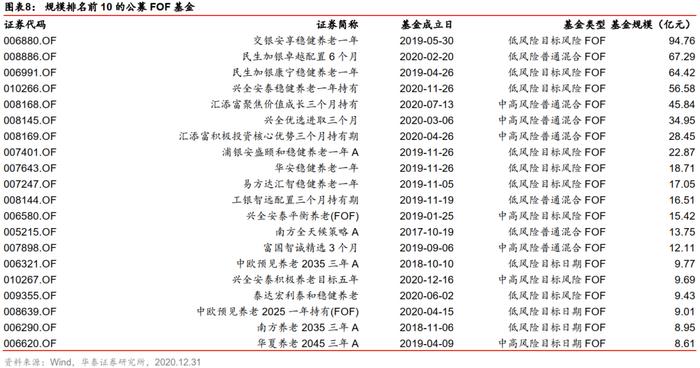 截止2020年12月31日数据,规模排名前10的FOF产品中,共有7只为低风险产品,其中又有6只为低风险目标风险FOF,此外,规模排名前4的产品均为低风险FOF。5-7名则为中高风险普通混合FOF。