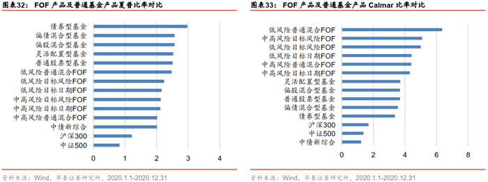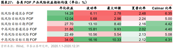 2020年全部FOF产品均获得正收益,平均收益为23.04%。分类型来看,目标风险FOF的风险调整后收益较高,但股市上行期间追涨能力较弱,中高风险目标日期FOF平均收益率最高,为34.06%。与股指债指相比,2020年绝大多数FOF产品的Sharpe和Calmar均显著高于股债指数。与普通基金产品相比,多重风控下的FOF产品回撤控制能力明显更强,且平均管理费率明显低于普通股债混合型基金以及主动股票型基金,与长期资金追求低回撤低费率的需求相匹配。