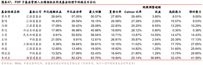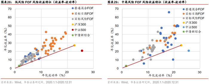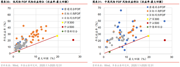我们采用2020年数据,对低风险FOF和中高风险FOF的风险收益特征进行了统计,并与股债指数进行对比。我们发现全部低风险FOF以及大部分中高风险FOF的收益率-波动率散点和收益率-最大回撤散点均在沪深300和中债新综合与原点连线之上,可见其管理人通过大类资产配置获取了高于单一资产的夏普比率和Calmar比率。