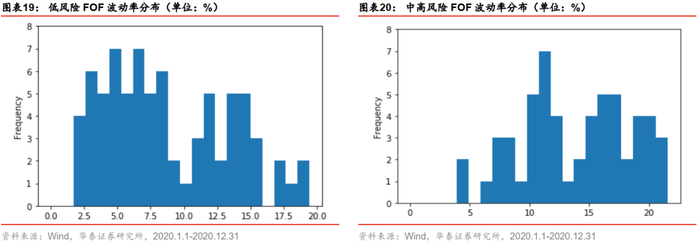 2. 对于普通混合型FOF,我们采用基金波动率来估算其风险水平。从2018年初到2020年底,沪深300指数年化波动率为21.42%,中债新综合财富指数年化波动率为1.17%,我们据此估算,将年化波动率小于7.24%的基金(30%*21.42%+70%*1.17%=7.24%),划分为低风险FOF,其余归为中高风险FOF。