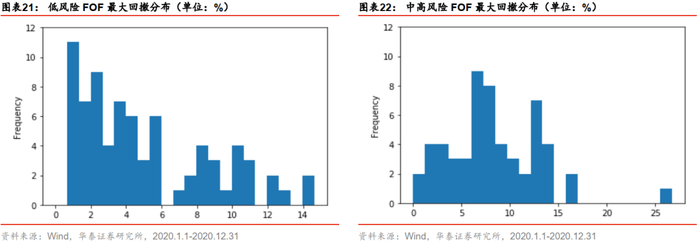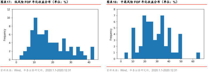 2020年全部FOF产品均获得正收益,平均收益为23.04%。分项来看,低风险FOF的年化收益率集中在10%-20%区间,而中高风险FOF的年化收益率在20%-40%区间。低风险FOF的波动率和最大回撤呈现左偏分布,中高风险FOF的风险指标则呈现右偏分布。