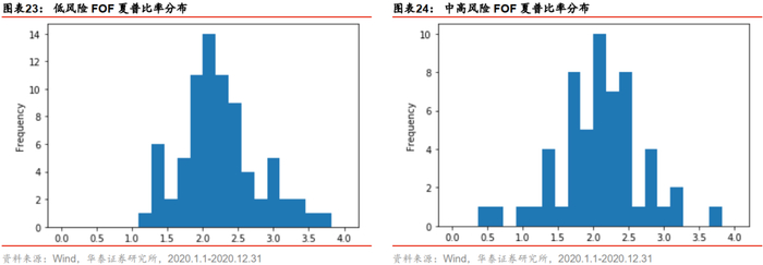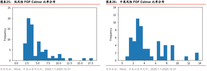 而从风险调整收益指标来看,低风险FOF和中高风险FOF的夏普比率和Calmar比率分布相差无几,低风险FOF的Calmar比率分布尾部更长。