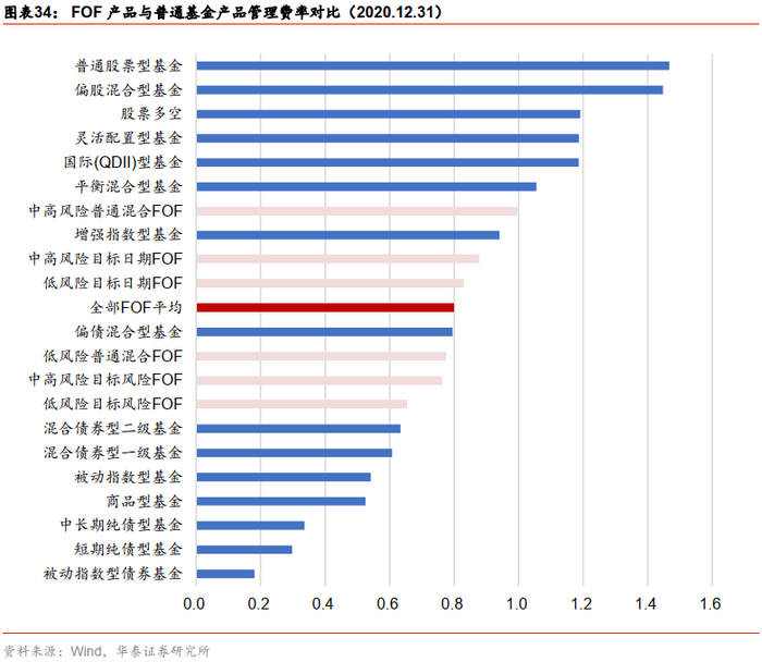 1. FOF产品的平均管理费率明显低于普通股票、偏股混合、灵活配置以及平衡混合这四类主动权益类基金,也低于股票多空基金和QDII基金。