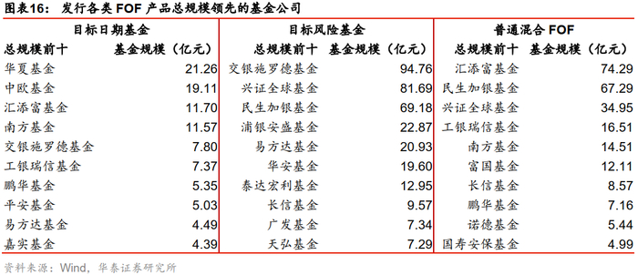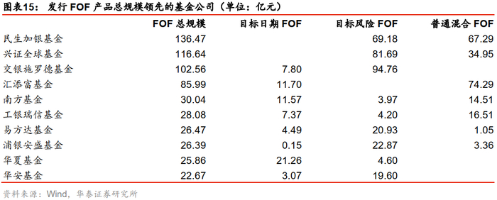 分基金类别来看,华夏、中欧、汇添富、南方和交银施罗德基金在管目标日期FOF总规模排名前五;交银施罗德、兴证全球和民生加银在管目标风险FOF总规模领先;汇添富、民生加银和兴证全球在管普通混合FOF总规模领先。
