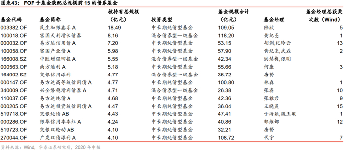 市场上99只公布了2020半年报的FOF产品所配置的全部子基金中,所配规模前三的债券型基金(包括QDII债券型基金)包括民生加银鑫享A、富国天利增长债券、易方达信用债、富国产业债和中欧增强回报等。我们也导出了基金的相关信息进行深入研究,发现这15只债券型基金中,绝大多数基金的基金经理曾获得过晨星基金奖、金牛基金奖、金基金奖或明星基金奖等权威第三方机构颁发的奖项。