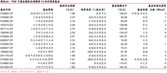 在股票型基金、混合型基金、QDII股票、混合基金和另类投资基金中,持有规模最大的为海富通阿尔法对冲、汇添富医药保健和汇添富蓝筹稳健,其中海富通阿尔法对冲A配置总规模为7.976亿元。QDII基金中,华夏恒生ETF和易方达恒生H股ETF等港股ETF配置比例较高。商品型基金中,华安黄金ETF则也较受FOF产品欢迎。基金总规模方面,前15名基金中有7只超过100亿元,但也有规模在几十亿元的小而美的基金。这15只基金最鲜明的特征是,绝大多数的基金经理曾获得第三方权威机构颁发的奖项,由此我们或可推断,FOF管理人更加偏好有获奖记录的基金经理所管理的产品。
