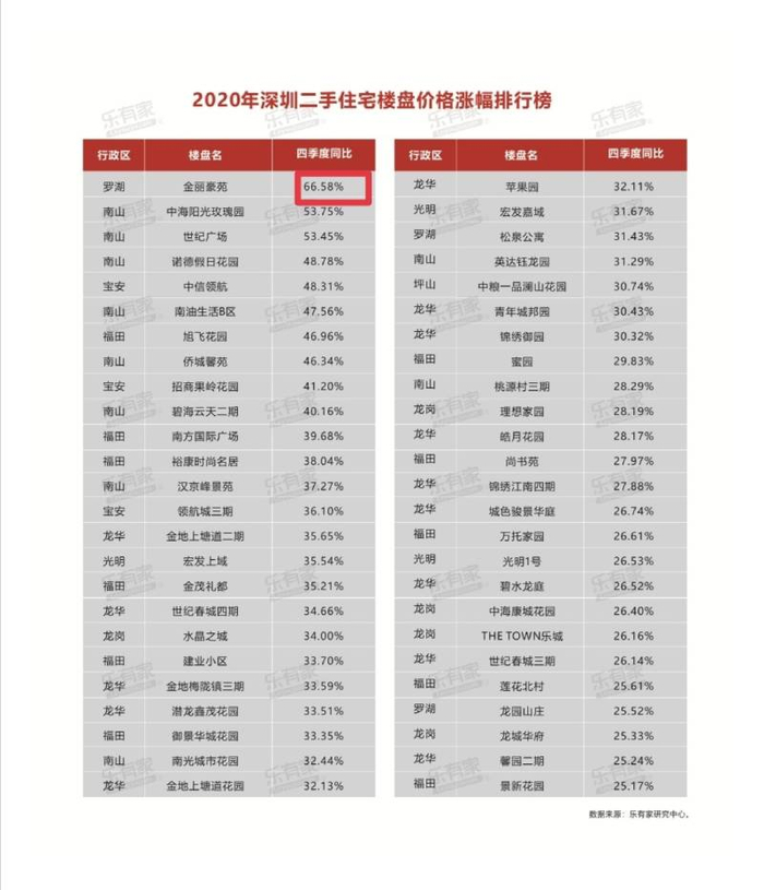 此前,乐有家统计了50个深圳关注度较高的楼盘在2020年四季度成交价格的同比涨幅,其中罗湖的金丽豪苑涨幅达到了66.58%,南山的中海阳光玫瑰园与世纪广场涨幅也超过了50%。