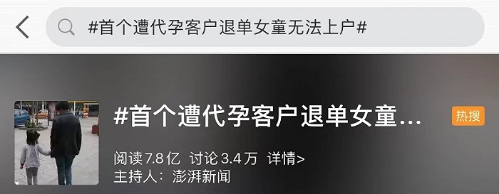 而近几日,一则“首个遭代孕客户退单女童无法上户”的新闻也登上了热搜。据了解,成都47岁代妈吴川川为财代孕,不料身染梅毒,遭客户退单。她怜惜胎儿拒绝流产,跑回老家产女,因生活拮据卖掉出生证,如今谋求为3岁女儿上户。