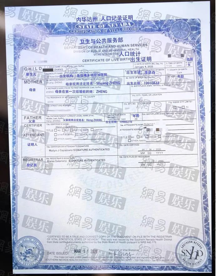 据网易娱乐,张恒朋友提供了两个小孩在美国的出生证明。一份《内华达州人口记录出生证明》显示,女童出生时间为2020年1月4日;母亲现用法定姓名“Shuang ZHENG”,年龄28;父亲现用法定姓名“Heng ZHANG”,年龄29,生日为1990年2月16日。