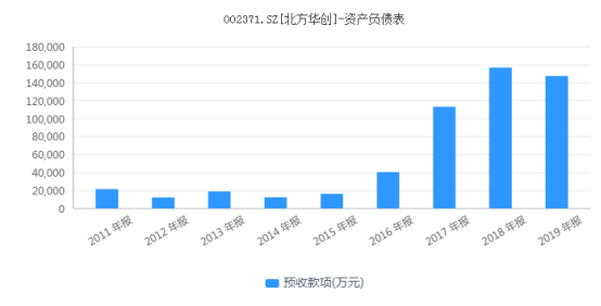 2017年开始,北方华创公司预收账款大幅增长,由以往年度大概2-4亿元预收账款一下子增长到10多亿元的预收账款。而2017年也正是北方华创股价起飞的阶段。