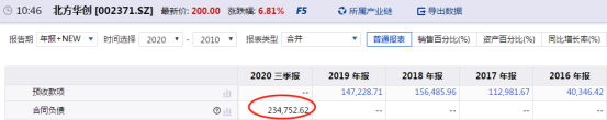 我们再来看看北方华创最新一季报的预收账款,2020年三季报显示,公司合同负债达到了23亿元,超过了以往任何年度预收账款。