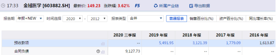 2018年、2019年,金域医学预收账款连续两年大幅增长,2020年三季报合同负债达到9千多万,延续高增长。可惜的是,金域医学预收账款占销售收入比例较低(2019年营业收入为52.7亿元),不足与太说明业绩问题,但起码也是侧面说明公司的业绩的高增长,公司的股价也是从2018年开始起飞。当然了,2020年新冠疫情,核酸检测业务是公司业绩加速的阶段。公司的预收账款比较低,与公司第三方诊断业务周期短有比较大的关系,而不需要太高比例的预收账款账款。