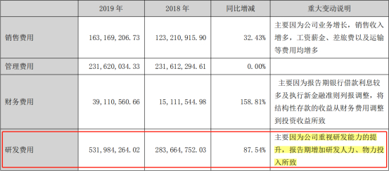在财务报表上,研发费用是放入管理费用项目。2019年年报显示,研发费用同比增长87.54%,主要因为公司重视研发能力的提升,报告期增加研发人力、物力投入所致。