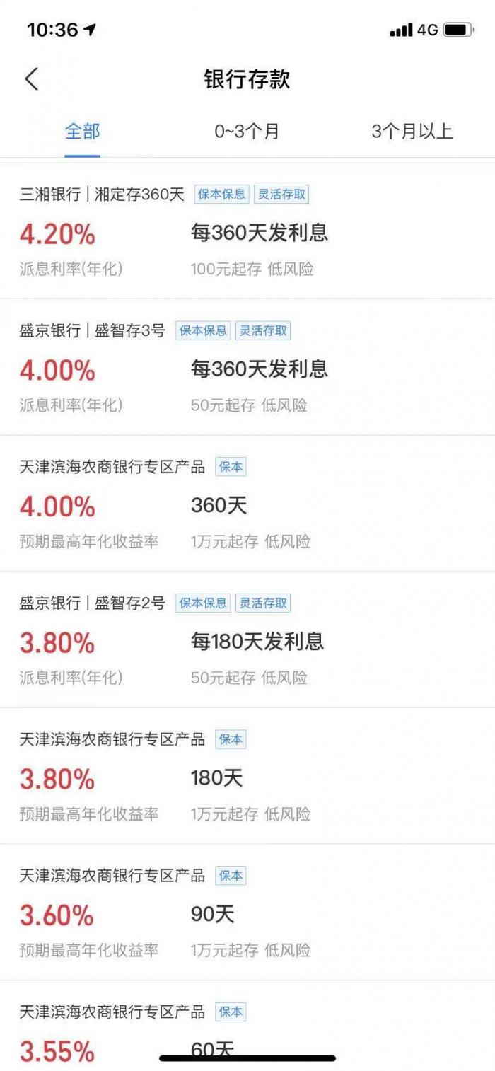 李飞向记者展示了他在支付宝的银行存款页面,仍显示着三湘银行、盛京银行、天津滨海农商行等银行存款产品,李飞成功购买了天津滨海农商行一款产品。