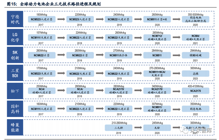 主流电池企业竞逐高镍化。随着近年国内补贴政策引导高比能产品方向, 2017-2018年补贴额度与能量密度挂钩,国内龙头企业的电池单体能量密度得到快 速发展,至今宁德时代主流乘用车NCM811产品电芯能量密度已实现260Wh/kg,超 越部分日韩企业水平。日韩电池企业也在积极布局高镍技术,LG化学圆柱NCM811 电池已批量供应特斯拉,SK创新已准备好生产更激进的NCM9/0.5/0.5电池,松下 NCA技术领先,2170圆柱形电池比容量达到340Wh/kg,并计划2025年内将2170电 池的能量密度提升20%,三星SDI预计2021年后量产NCA方形电池,预计能量密度 至少为600Wh/L。